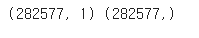 📝 X_train은 282577개의 행과 1개의 열로 이루어진 데이터프레임이고, y_train은 '시리즈 객체' 즉 282577개 원소를 가진 1차원 배열이다. (사이킷런이 입력으로는 2차원 배열, target으로는 1차원 배열을 기대하기 때문에 이런식으로 해줬다.)