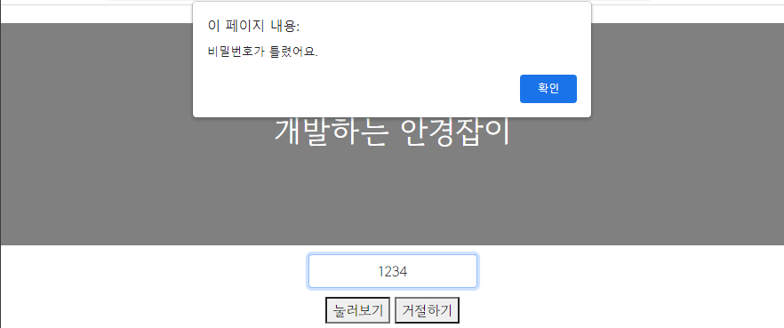 이번엔 비밀번호가 틀렸다고 나온다. 자, 이제 그럼 마지막으로 올바른 비밀번호를 입력해보자. 비밀번호 내 생일 비밀번호는 1121이다.