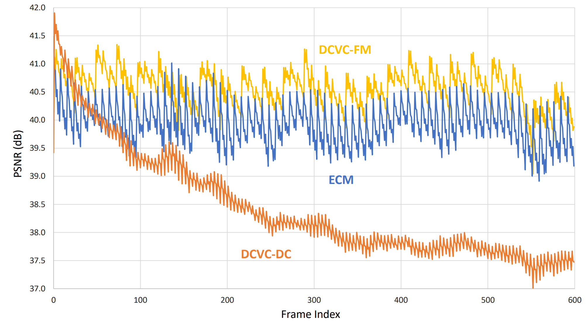 그 결과, I 프레임 하나로 동영상 전체를 코딩하더라도 비교적 안정적인 모습을 보인다. (ECM은 딥러닝이 아닌 전통적인 코덱 방식)