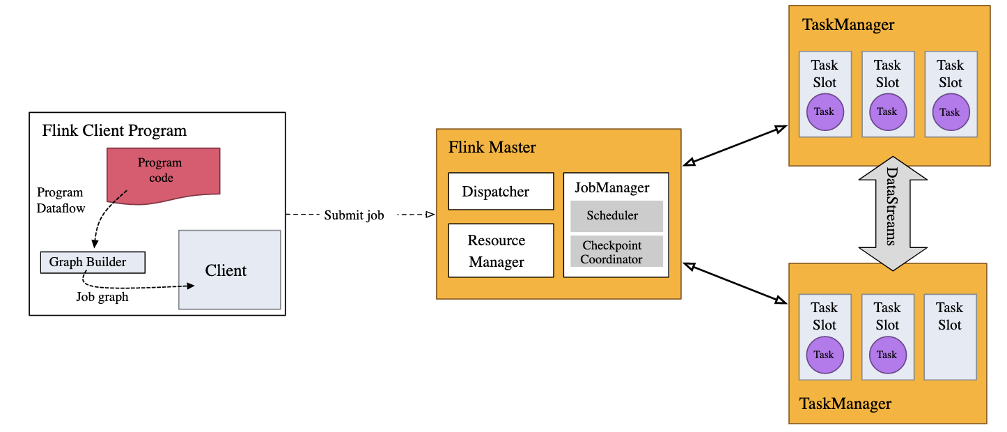 Flink는 기본적으로 parallel and distributed 하다. 이를 담당하는 애들이 JobManager와 TaskManager인데, TaskManager는 말 그대로 어떤 task slot 에서 task를 수행하는 역할을 하고, JobManager가 TaskManager에게 task들을 분배하는 역할을 한다.
