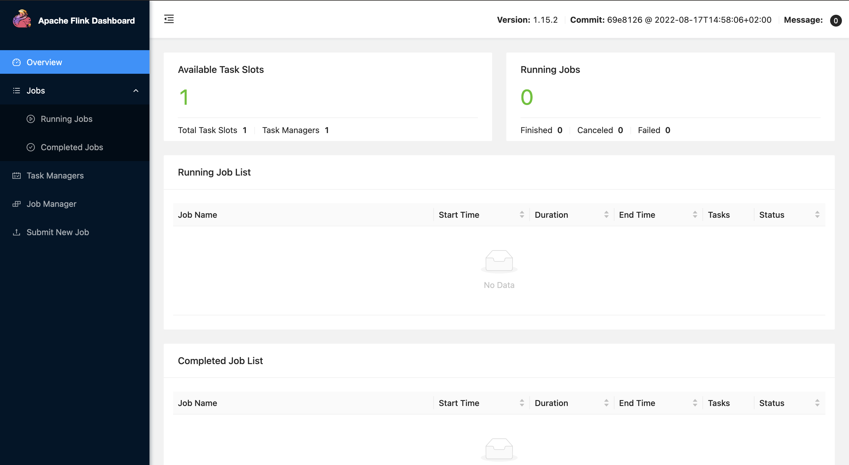 이렇게 로컬에서 기본적으로 Task Manager 1개를 가진 Flink 대시보드를 launch 할 수 있다.