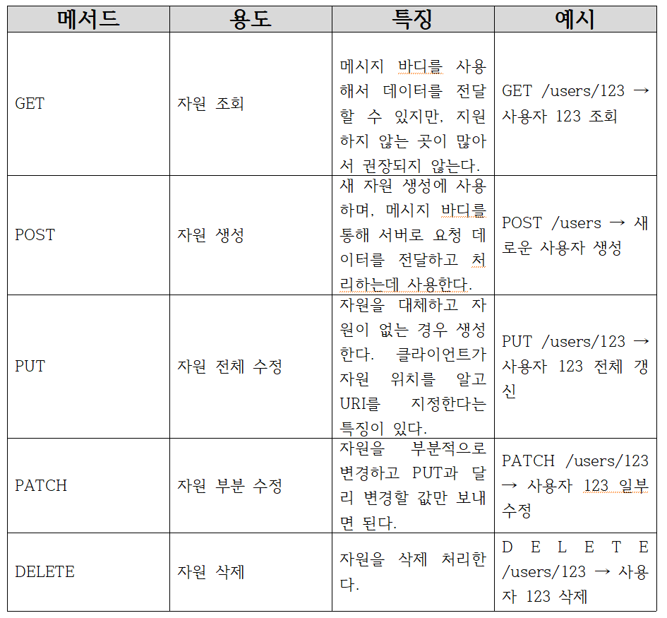 이부분은 상대적으로 다른 내용에 비해 쉬운 부분이다. get(자원조회), post(자원 생성), put(자원 전체 수정), patch(자원 부분 수정), delete(자원 삭제)가 있다.