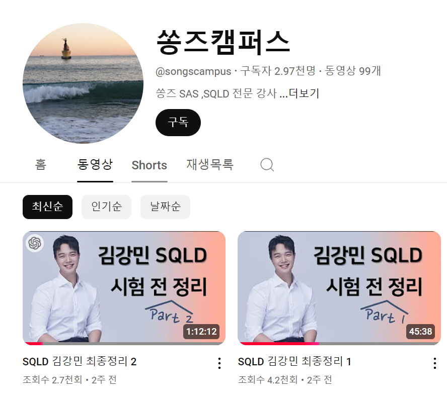 쏭즈캠퍼스 유튜브에있는 SQLD김강민 최종정리 1 2편은 전체 과목을 요약해주고 쉽게 설명해주는데 이 강의를 마지막에 들었던게 되게 큰 도움이 되었던 것 같다.