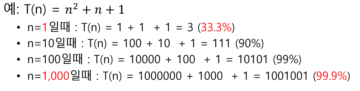 위 예시를 보면 n=100인 경우 T(n) = n^2+ n + 1에서 n^2이 99%의 영향을 주는 것을 볼 수 있다.