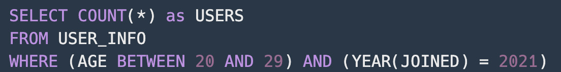 USER_INFO 테이블에서 2021년에 가입한 회원 중 나이가 20세 이상 29세 이하인 회원이 몇 명인지 출력하는 SQL문을 작성해주세요.