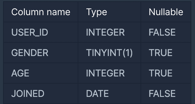 다음은 어느 의류 쇼핑몰에 가입한 회원 정보를 담은 USER_INFO 테이블입니다. USER_INFO 테이블은 아래와 같은 구조로 되어있으며 USER_ID, GENDER, AGE, JOINED는 각각 회원 ID, 성별, 나이, 가입일을 나타냅니다.