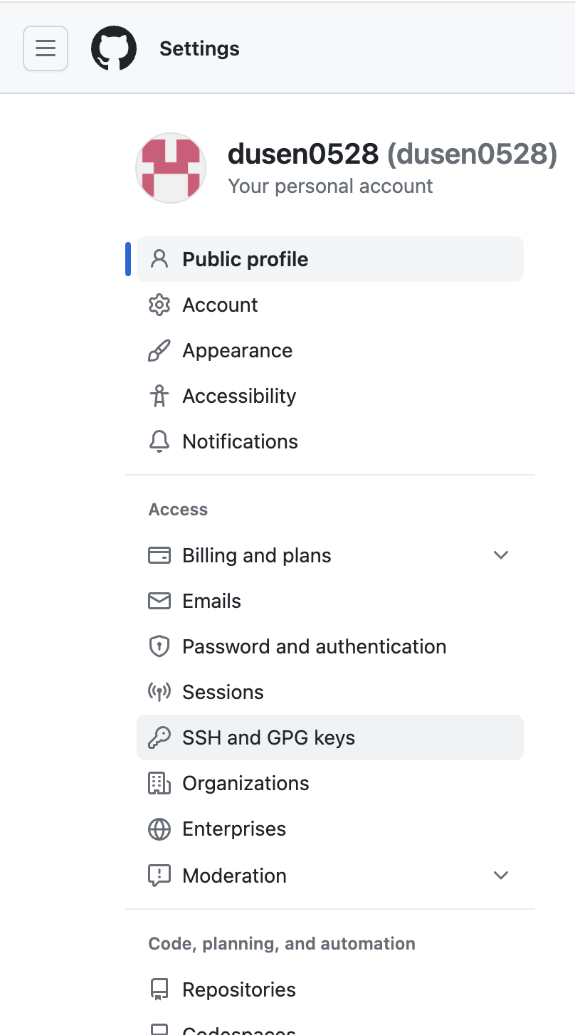 이후 gitHub 홈페이지 로그인 후 설정에 들어가서