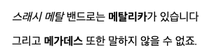 <p><em>스래시 메탈</em> 밴드로는 <strong>메탈리카</strong>가 있습니다</p> <p>그리고 <strong>메가데스</strong>또한 말하지 않을 수 없죠.</p>