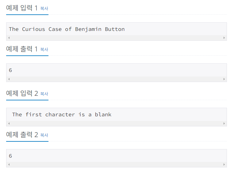 테스트 케이스 1번만 보고 내가 아무렇게나 입력해봐도 올바른 단어 수가 나오길래 당당히 제출했는데 그렇다.. 당연히 오답이 나왔다
