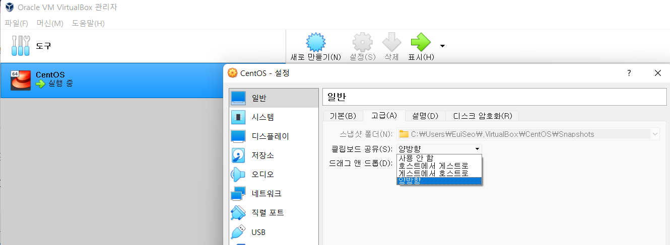 VirtualBox 설정 - 일반 - 고급 - 클립보드 공유 - 양방향