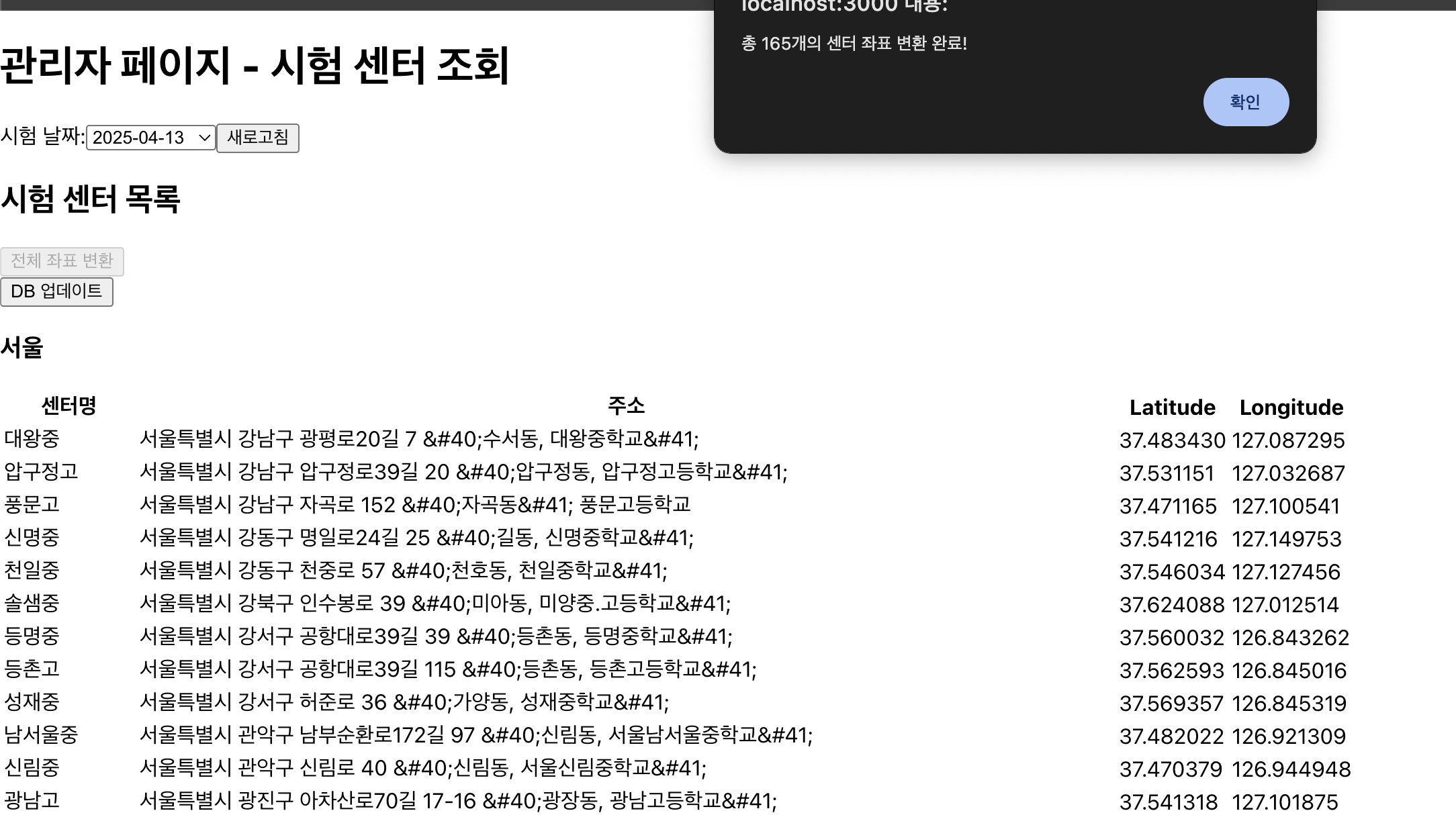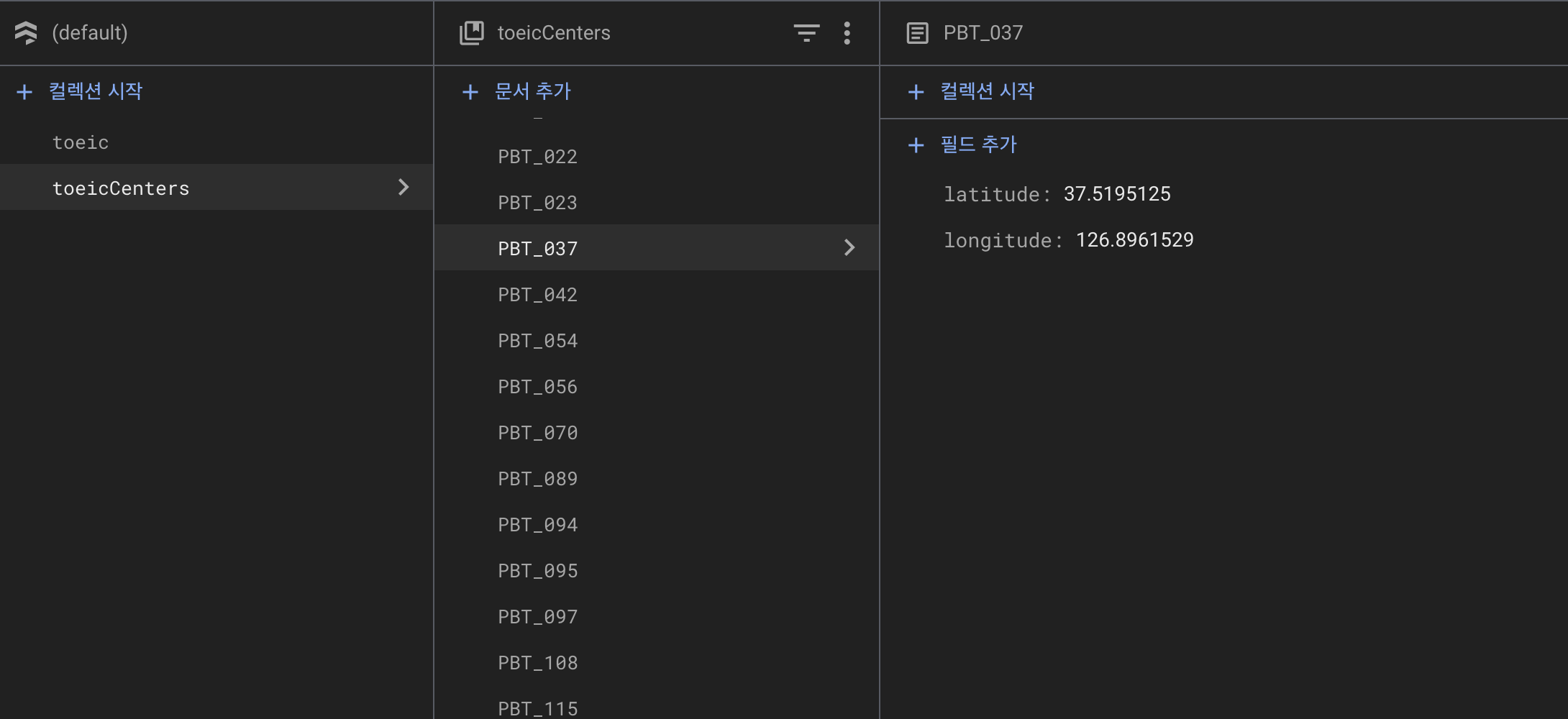 시험장 코드를 id로 필드에 위도 경도 값이 잘 들어가 있는 것을 확인했다.
