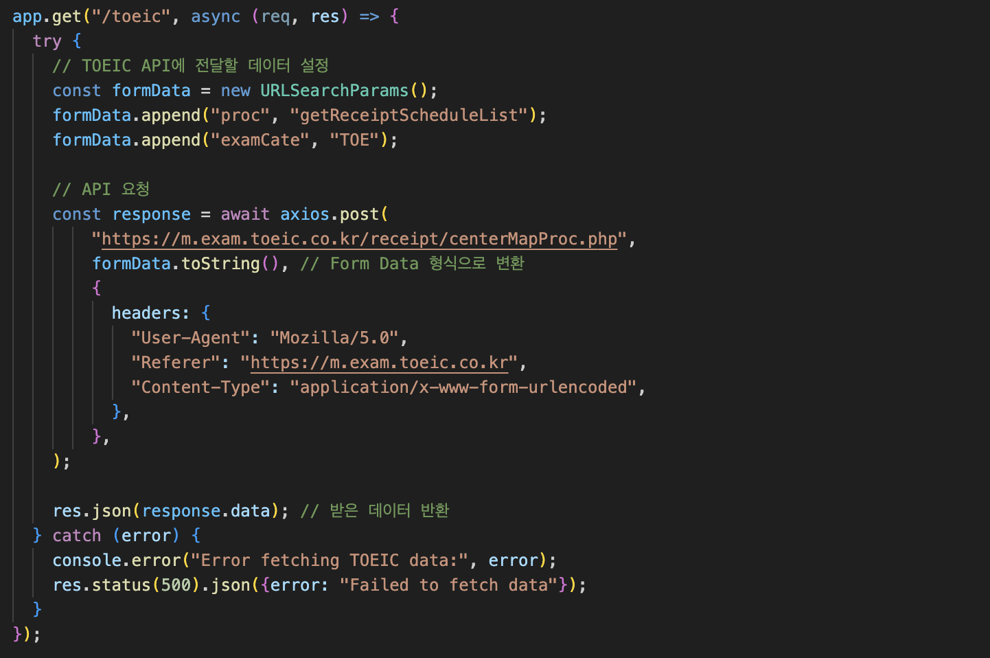 이런 식으로 가볍게 작성해서 배포하면, CORS를 피하기 위한 서버 뚝딱 완성! 리액트에서 해당 서버로 요청을 바꾸니 성공하였다.