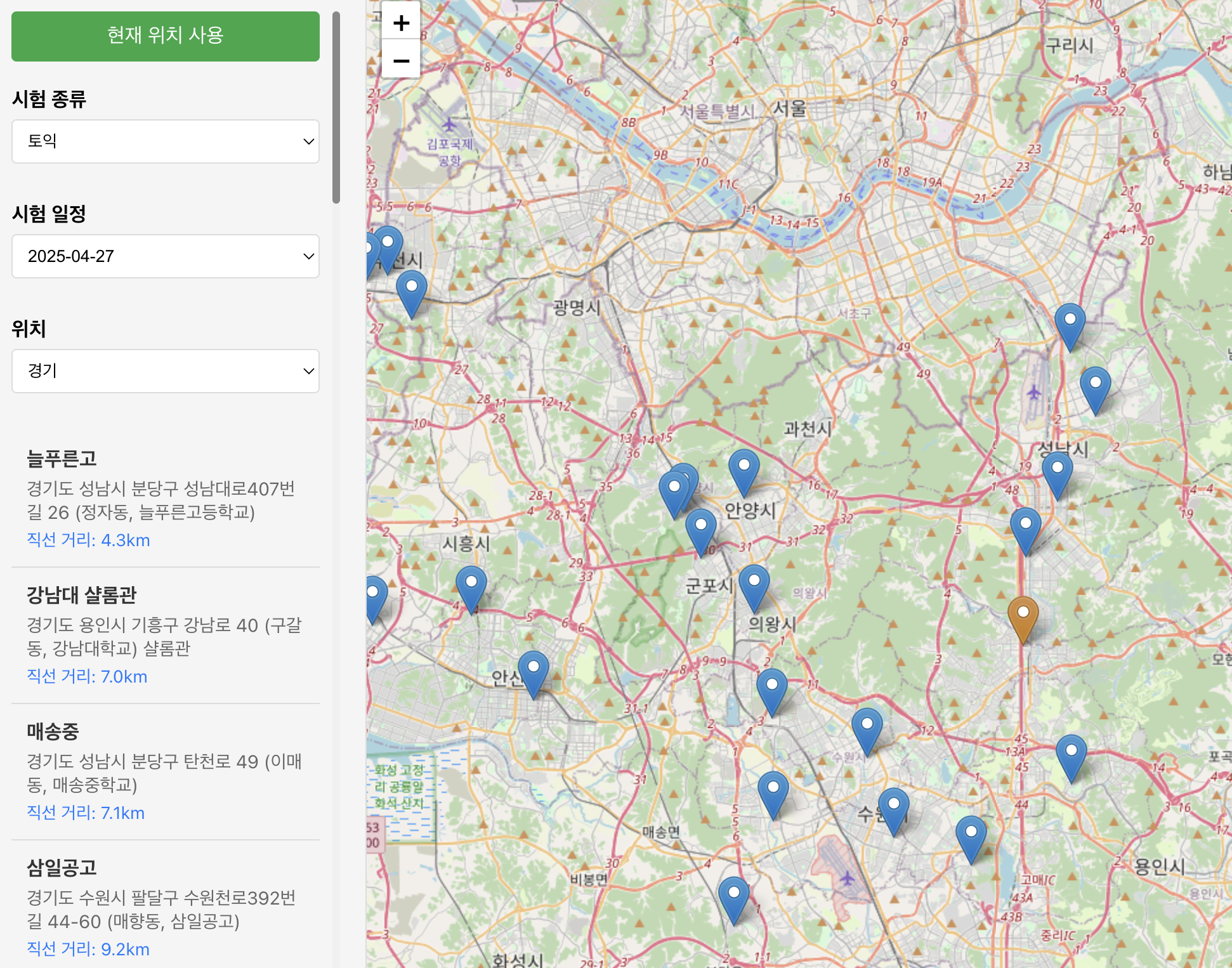 사용자 드롭다운 메뉴 선택 -> 해당 조건에 해당하는 시험장 리스트 요청 & 반환 -> 각 시험장 코드에 해당하는 좌표 DB에 일괄 요청 API -> 표현