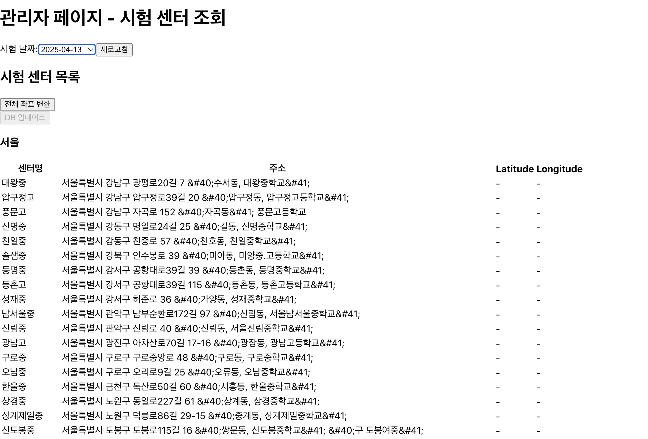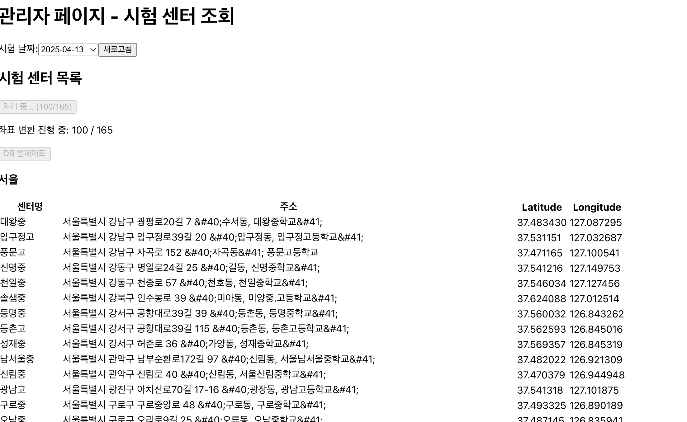 시험장 좌표는 고정값, 시험장은 종류는 어차피 관리자 수동 업데이트 방식으로 할 거라면...