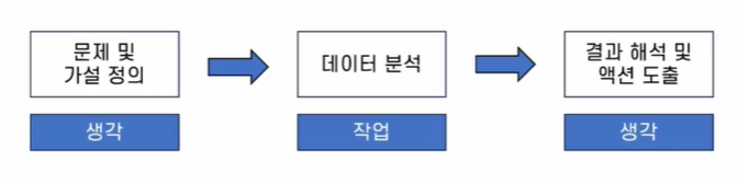 데이터 분석 접근법 : 문제 및 가설 정의(생각) > 데이터 분석(작업) > 결과 해석 및 액션 도출(생각) >> 보통 생각 부분에서 문제가 되는 경우 많음 , 데이터 분석 자체가 목적이 되지 않도록 왜를 항상 생각해야함