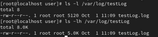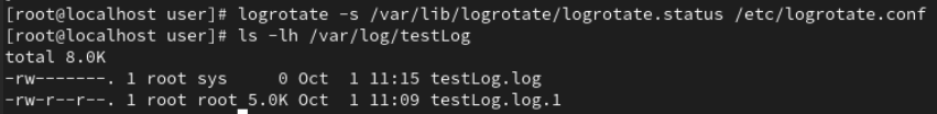 logrotate명령으로 수동으로 로그를 순환시켰다. 기존에 생성했던 testLog.log파일은 testLog.log.1로 수정되었고, 새로운 로그 파일이 생성된 것을 확인할 수 있다.