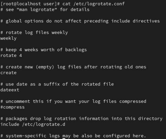 log rotate 설정은 위 logrotate.conf파일을 이용한다. 순환 주기, 보관 기간과 같은 옵션이 담겨 있고 이를 통해 새로운 로그 파일을 만들어 관리하게 된다. 실습은 logrotate 기준을 기간으로 잡을 경우 오랜 시간이 걸리므로 크기를 기준으로 진행하겠다.