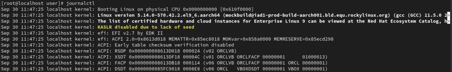 journalctl 명령을 옵션과 인자 없이 실행하면 현재 저장된 저널 데이터를 확인할 수 있다. 여기서 가장 먼저 출력되는 것은 부팅 관련 로그이다.