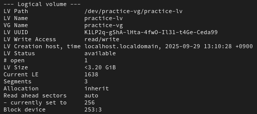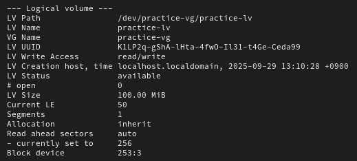 - 생성한 볼륨 그룹에서 100M 크기의 논리볼륨을 생성하세요. 이름은 practice-lv 로 합니다.
