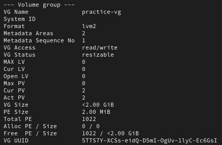 vgcreate practice-vg /dev/sdb1 /dev/sdb2 -s 2M