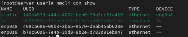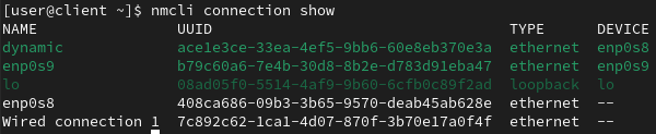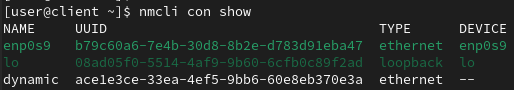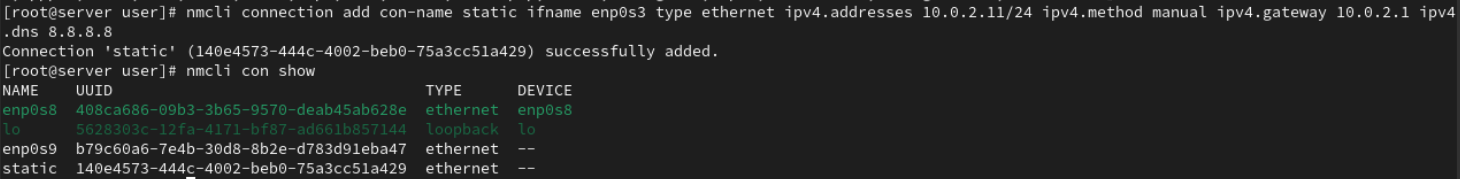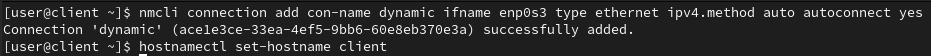 먼저 nmcli connection add명령으로 dynamic이라는 이름의 enp0s3 네트워크 연결을 생성하고 host 이름을 설정한 후 생성된 연결 정보를 확인한다.