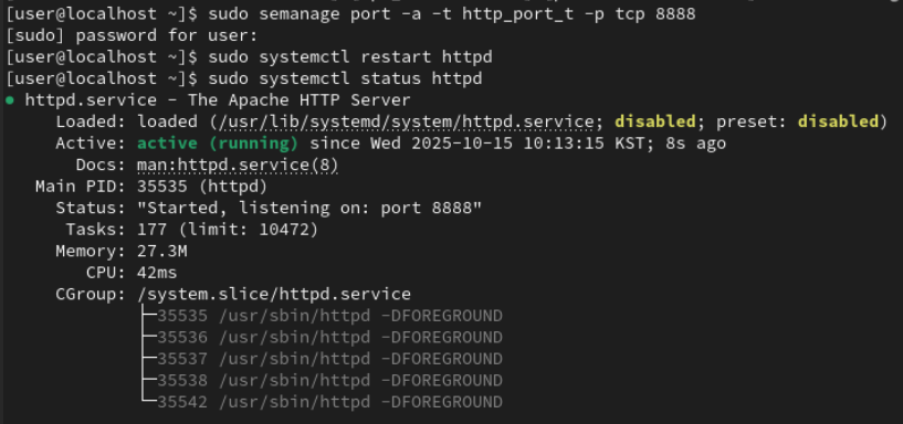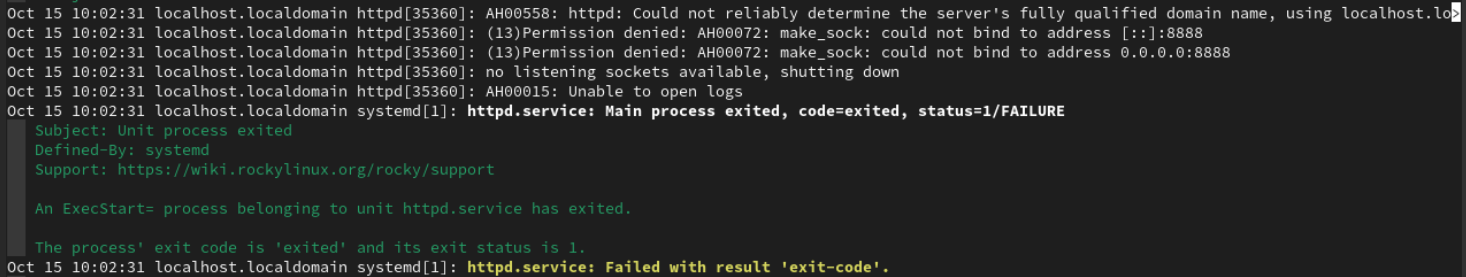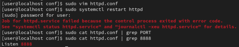 /etc/httpd/conf/httpd.conf에 http 관련 설정을 할 수 있는데, port를 8888번으로 변경하고 httpd 서비스를 재시작하면 사진과 같이 에러 메시지가 발생한다.