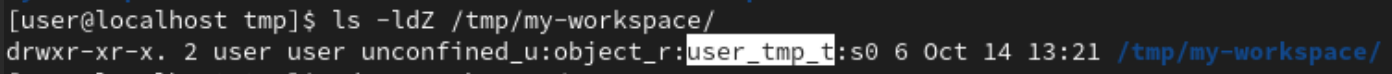 ls명령에 -Z옵션을 이용해서 Context 확인이 가능하다. 나는 /tmp디렉토리 안에 디렉토리를 하나 더 만들어 확인했고, 현재 user_tmp_t로 context가 설정되어 있음을 알 수 있다. context는 생성한 사용자의 umask에 따라 달라진다.