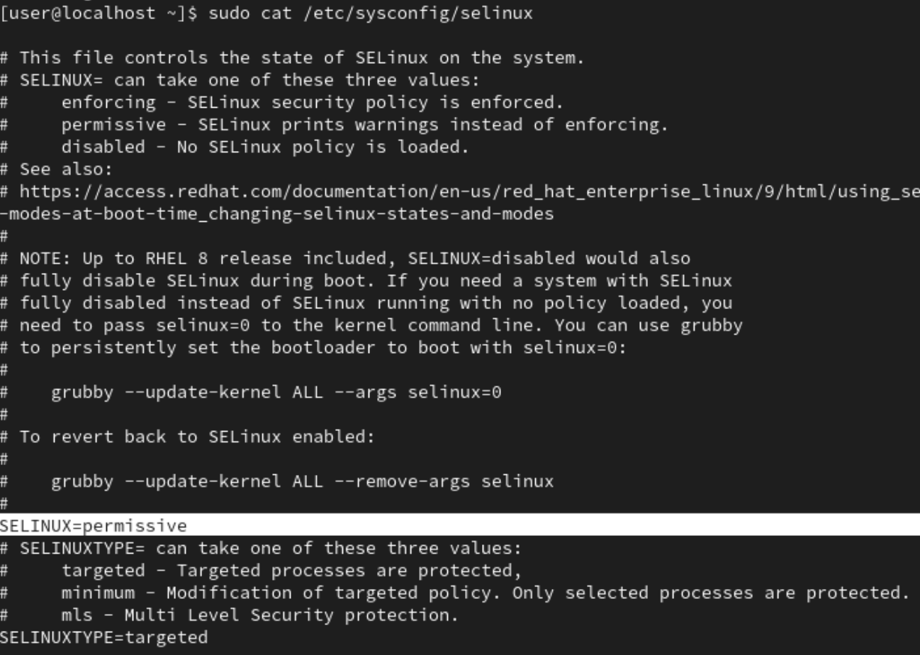 SELinux 영구 설정은 /etc/sysconfig/selinux파일에 담겨 있고 세 가지 모드를 설정하고 저장하면 적용된다.