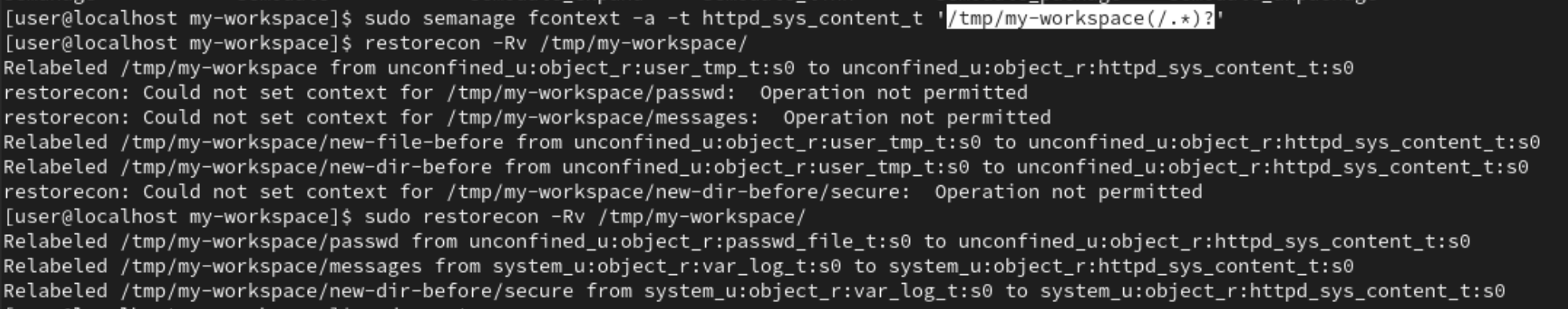semange명령을 이용해서 context 기본값을 설정할 수 있다. 하이라이팅 된 곳 /tmp/my-workspace밑에 생성되는 모든 파일을 의미한다. 즉, 설정한 디렉토리 밑에 생성되는 모든 파일, 디렉토리는 설정값을 따른다는 의미이다.