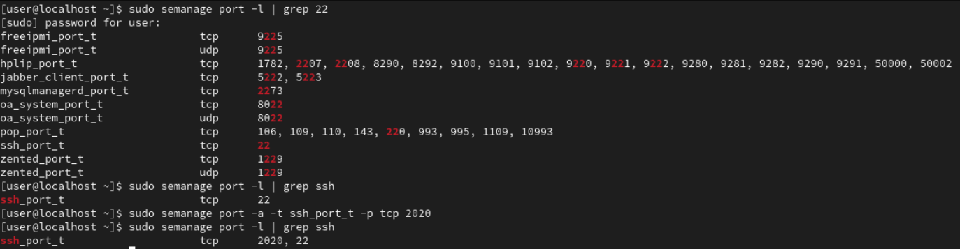 22번 포트를 사용하는 서비스는 ssh이고, 해당 서비스의 Port Label은 ssh_port_t임을 알 수 있다. 22번 대신에 2020번 포트를 사용하려고 한다면 위와 같이 semanage명령에 -a옵션을 주면 추가할 수 있다.