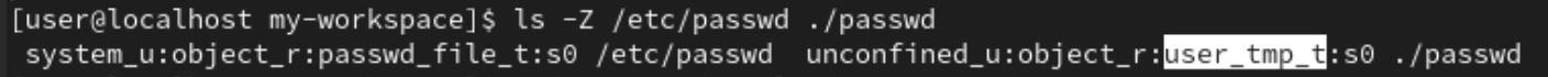 /etc/passwd파일을 생성한 디렉토리에 복사한 후 원본 파일과 복사한 파일의 context를 확인 해봤다. 원본 파일의 context는 passwd_file_t 복사본은 user_tmp_t임을 확인할 수 있었고, 복사한 사용자에 따라 context가 설정됨을 확인할 수 있다. 만약 원본 그대로 복사하고 싶다면 -a옵션을 추가해서 복사하면 된다.