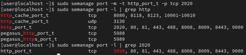 ssh 서비스에 설정한 2020 포트를 http 서비스에서 사용하기 위해 변경한 결과다. 마찬가지로 semange명령에 -m옵션을 주면 Port Label 설정이 가능하다.
