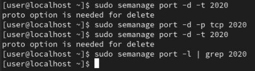 설정한 포트를 삭제할 때는 semange명령에 -d옵션을 주면 된다. 해당 명령 수행 후 레이블을 확인 해보면 삭제가 됐음을 알 수 있다.