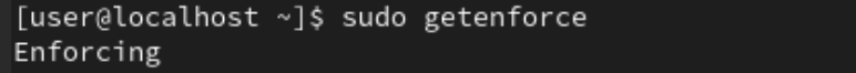 getenforce 명령으로 SELinux의 활성화 상태를 확인할 수 있고, 현재 활성화 되어 있음을 확인할 수 있다. setenforce명령에 0 | 1을 설정하면 각각 permissive, enforcing 상태로 설정 가능하다. 단, 이는 런타임에만 적용되고 reboot하면 초기 설정으로 돌아간다.