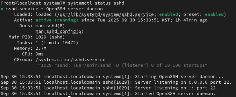 status 보조 명령은 지정한 유닛의 자세한 정보를 확인할 수 있다. 위 사진에선 sshd를 확인했고 활성화 상태, 경로, PID, Cgroup과 같은 정보들을 확인할 수 있다.