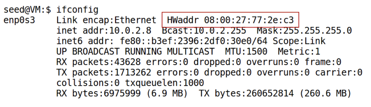 VM에 ifconfig 명령으로 network 정보를 보면 HWaddr이라고 되어 있는 부분에서 MAC주소를 확인할 수 있습니다. MAC주소는 앞 3byte가 제조사 고유번호이고, 뒤 3byte가 NIC 고유주소입니다.