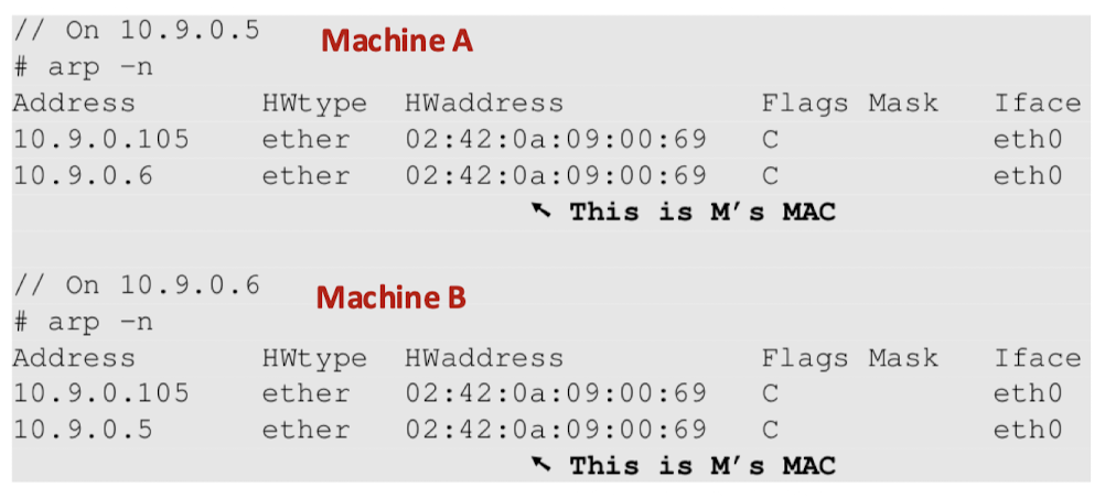 10.9.0.5를 client, 10.9.0.6을 server로 가정하고, 각각의 ARP Cache table이 Poisoning 되어 Attacker의 MAC 주소로 mapping 된 것을 확인할 수 있습니다.