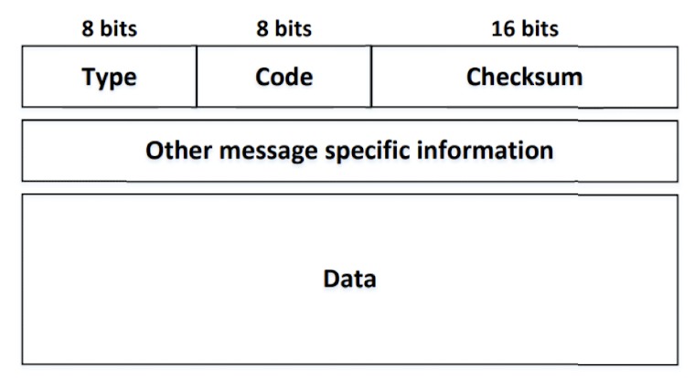 Control Message에는 Echo request/reply(eg. ping), Redirect, Timestamp request/reply, Router advertisement/solicitation이 있고, Error Messages에는 Destination unreachable, Time exceeded가 있습니다.