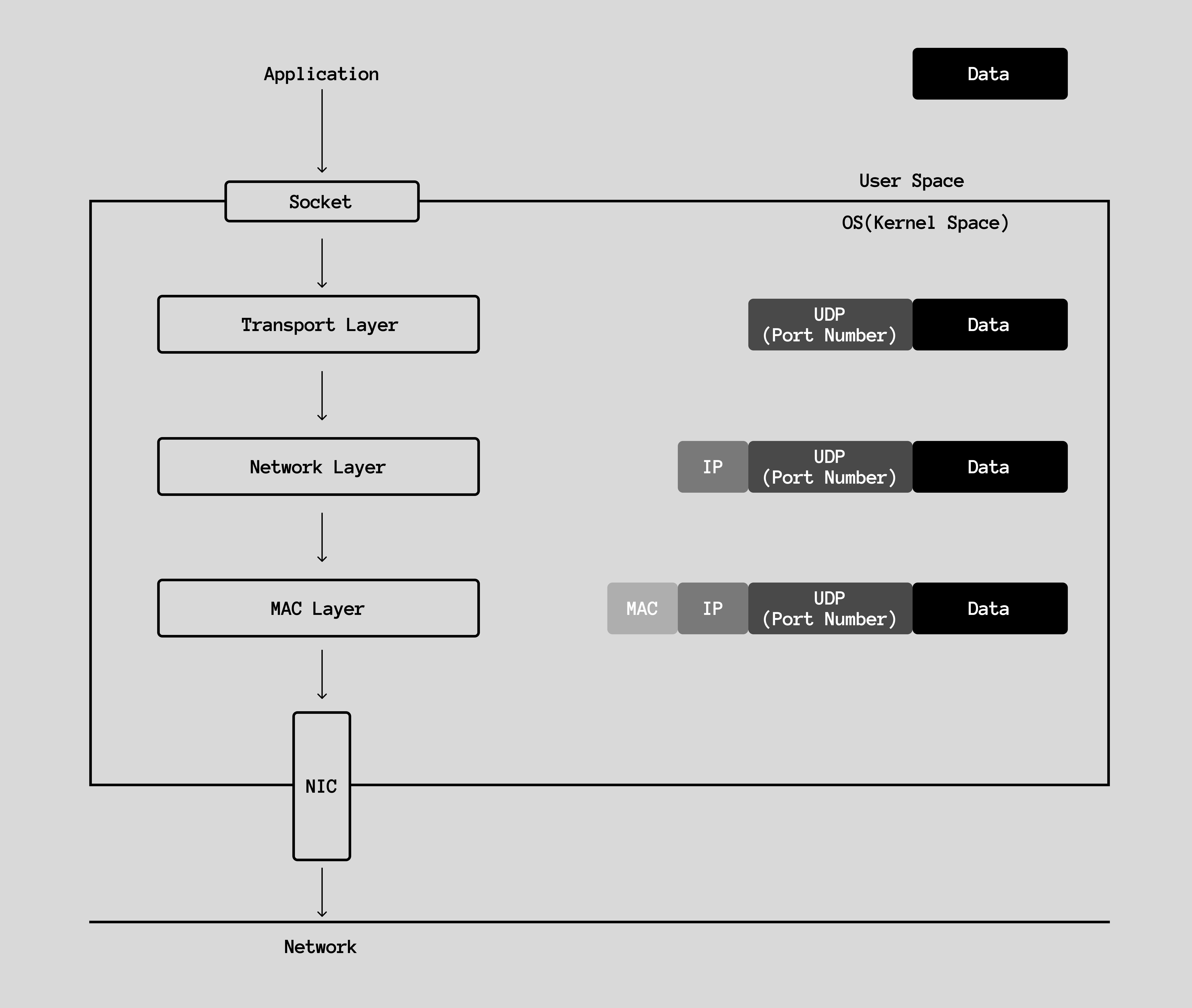 먼저 User space의 Data가 Socket을 통해 Kernel Space로 내려가서 각 Layer에서 Port Number, IP, MAC header가 붙여져 Packer이 구성되어 NIC(Network Interface Card)를 통해 Packet이 나가게 됩니다.
