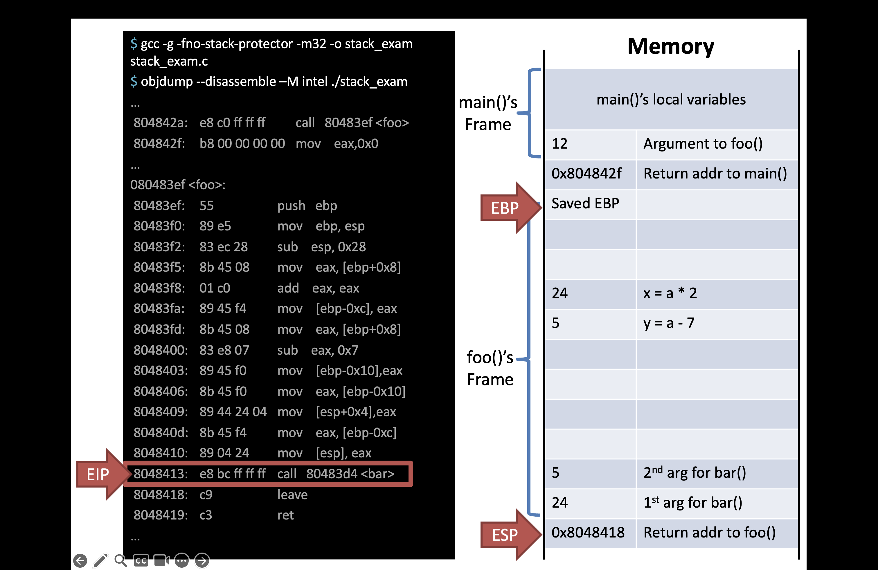 아래 두 사진은 foo, bar 각각의 함수에 대해 어셈블리 수준에서 어떻게 컴파일되고, 그에 따라 스택에 어떻게 프레임이 쌓이는지를 보여주는 그림입니다.