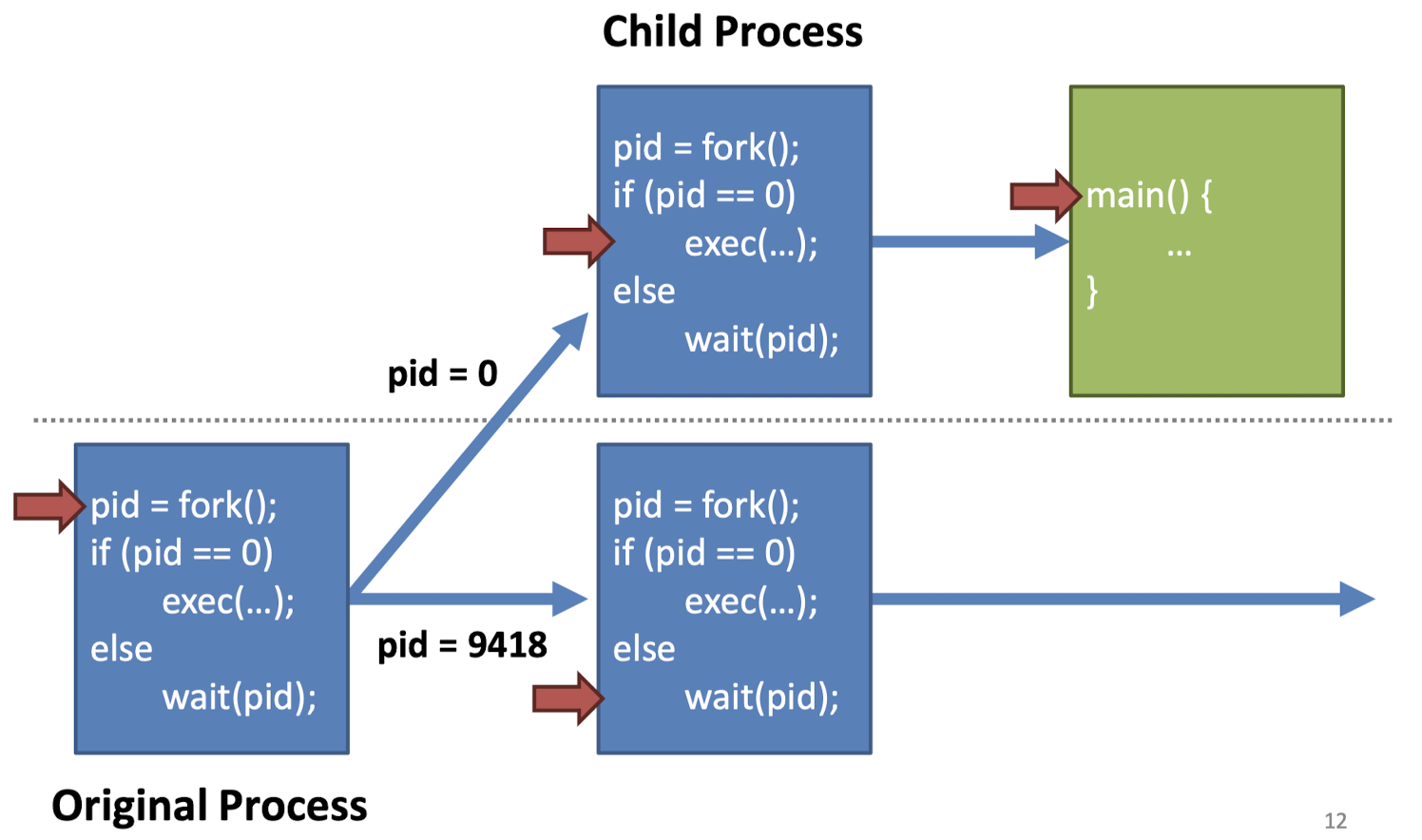 위 사진은 fork()의 동작을 시각화 한것입니다. Original Process를 복사하여 pid = 0으로 설정하고 exec()을 이용해 child process를 실행 시키고 있습니다.