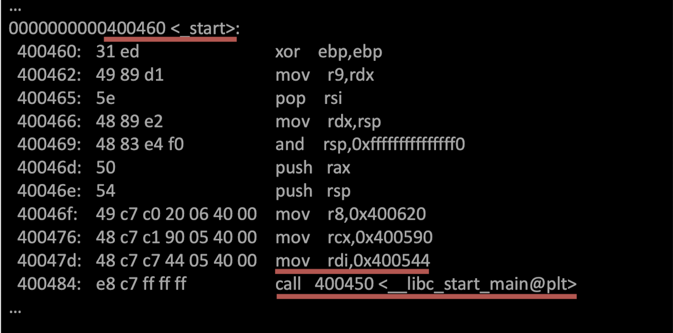 objdump --disassemble -M intel ./test명령을 수행했을 때 위에서 Entry point의 주소가 main이 아닌 start로 되어 있는 것을 확인 할 수 있습니다. 우리가 작성하진 않았지만 main 함수를 무조건 호출하는 코드가 담겨 있는 주소입니다. main함수도 argument가 필요하고, stack에 대한 처리, argument 설정 등과 같은 과정을 main 함수가 할 수 없고 개발하는 사람들이 고려하지 않기 때문에 start가 이 과정을 main() 실행 전과 후에 모두 처리 해줍니다.