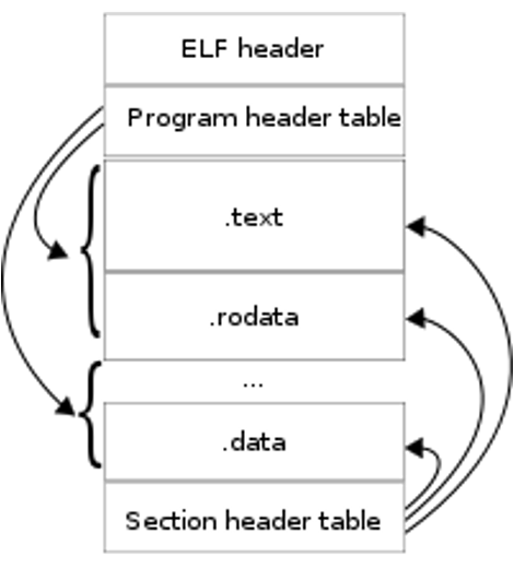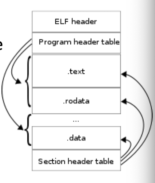 먼저 ELF Header에는 호환성 정보로 실행 가능한 코드의 Entry point가 담겨 있고, Program header table에는 프로그램 load와 실행을 위한 파일의 모든 segment들이 담겨 있습니다. Section header table에는 linker단계에서 section 단위로 code, data를 다룰 때 사용합니다.