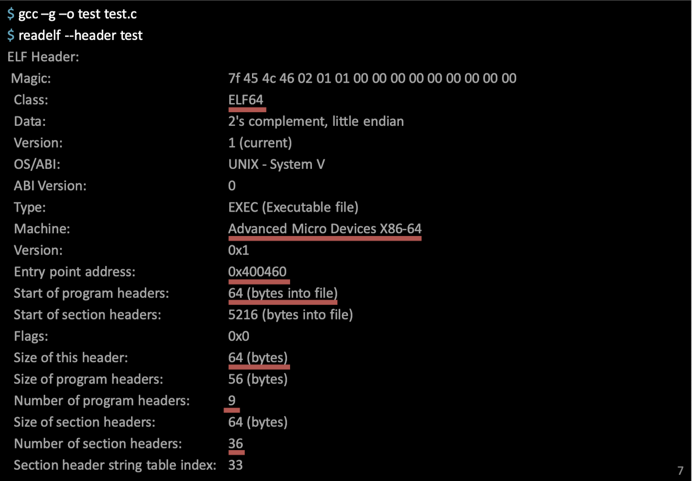 linux환경에서 test.c를 컴파일하여 readelf 프로그램을 통해 header option을 줘서 실행시킨 결과입니다.
