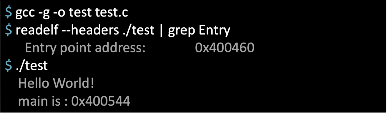 C로 작성된 code는 무조건 main함수부터 시작하여 프로그램의 시작점을 나타내는 entry point와 main의 주소가 같을거라고 예상 했지만, readelf 프로그램을 통해 test.c의 entry point를 출력하고, test.c를 실행했을 때 main함수의 주소가 서로 다른 것을 확인할 수 있습니다.