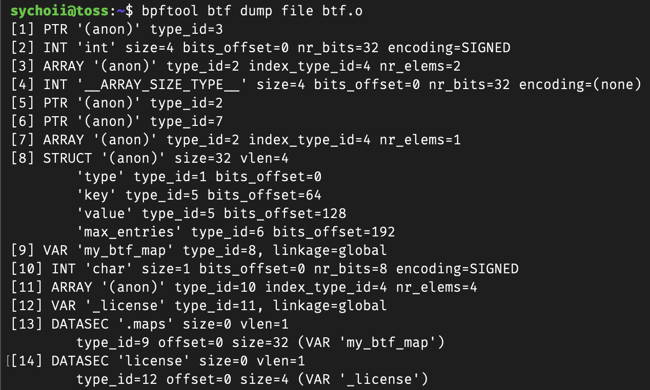 다음 btf 덤프 파일을 보면 key 필드가 존재하고 타입은 type_id=5라는 것을 알 수 있다. 5번 섹션을 보면 PTR 즉, 포인터이고 이 포이터가 가리키는 곳은 type_id=2라는 것을 알 수 있다. 2번을 보면 정확히 INT 'int ...'라고 기록 되어 있는 것으로 보아 기존 레거시 방식과 달리 자료형을 정확히 파악할 수 있다.