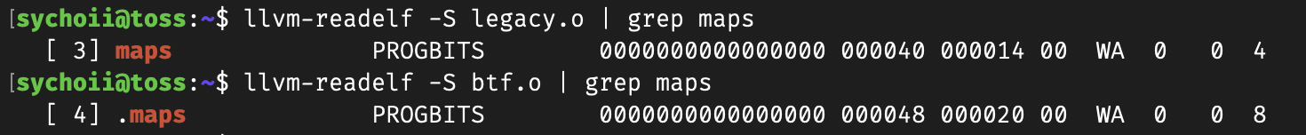 결과를 보면 이전 설명과 같이 legacy엔 maps, btf엔 .maps로 섹션이 저장된 것을 확인할 수 있다. 그리고 bpftool을 활용해서 생성한 오브젝트 파일을 덤프를 떠서 파일 구조를 확인해보자.