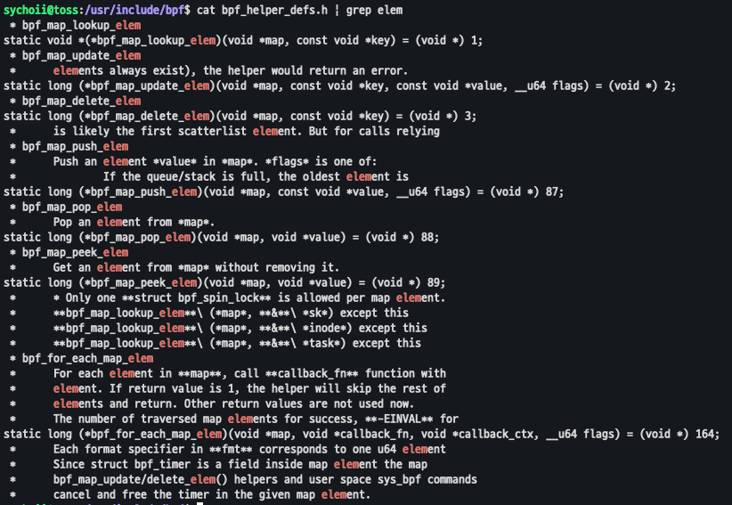 Kernel Level에서 동작하는 eBPF 프로그램이 Map을 사용할 때는 Helper 함수를 통해 Map과 상호작용하고, 이는 해당 함수에 정의되어 있다.