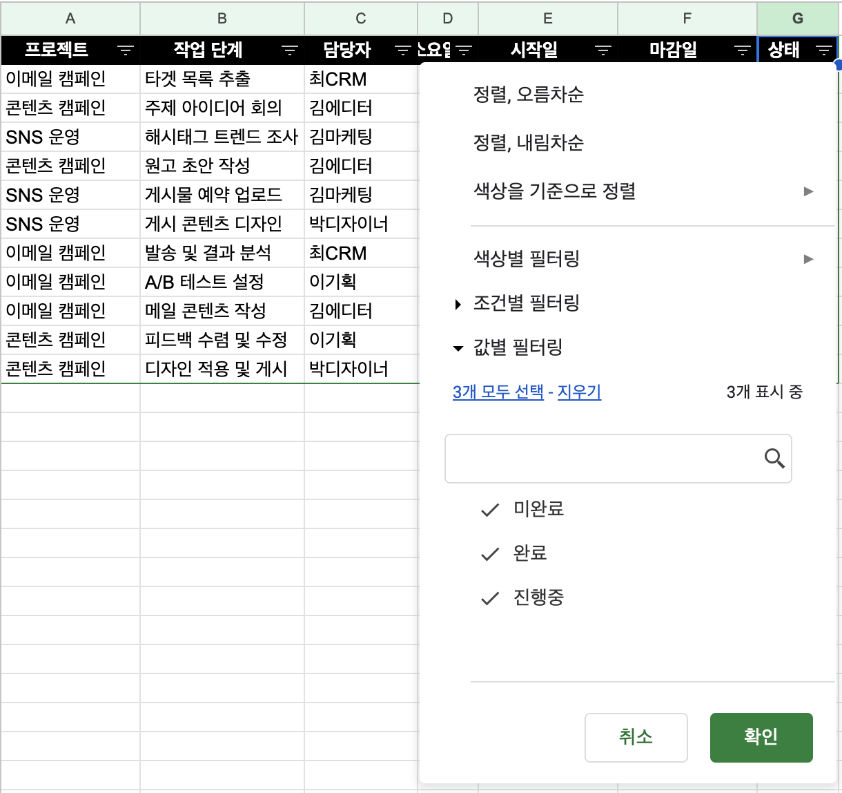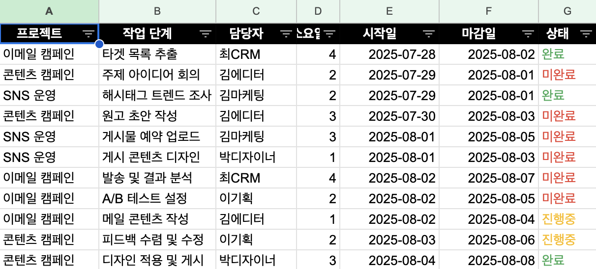 • 필터링할 데이터 선택 후 깔때기 모양(필터) 클릭하면 필터 자동 적용